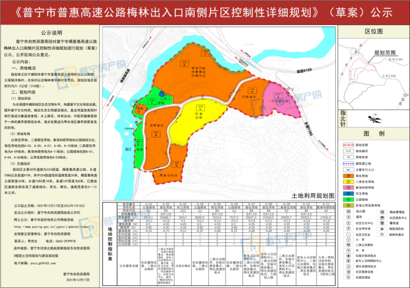 规划单元位于揭阳市普宁市普惠高速公路梅林出入口南侧、云落镇洋角村、古安村以及梅林镇华寮村交界处,规划区域总面积约为21.2公顷(318亩)。