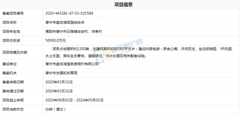 据了解,普宁市盘龙湾温泉度假村有限公司还将计划投资5亿元建设普宁市盘龙湾田园综合体,已于2020年3月备案通过,位于普宁市云落镇古安村、洋角村,项目占地面积约1200亩,总建筑面积约80000平方米;建设内容包括:养老公寓、休闲农庄、生态旅游园、VR乐园、水上乐园、房车生态营地、道路绿化、污水处理及相关配套设施。