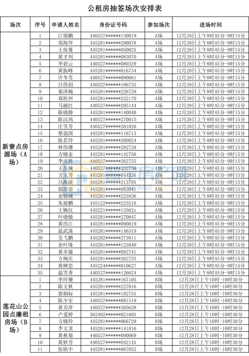 (一)A场:新寮点房源场(安排35户),12月28日上午8时45分开始登记进场,抽签者应于9时15分前登记进场等候,9时30分开始抽签;
