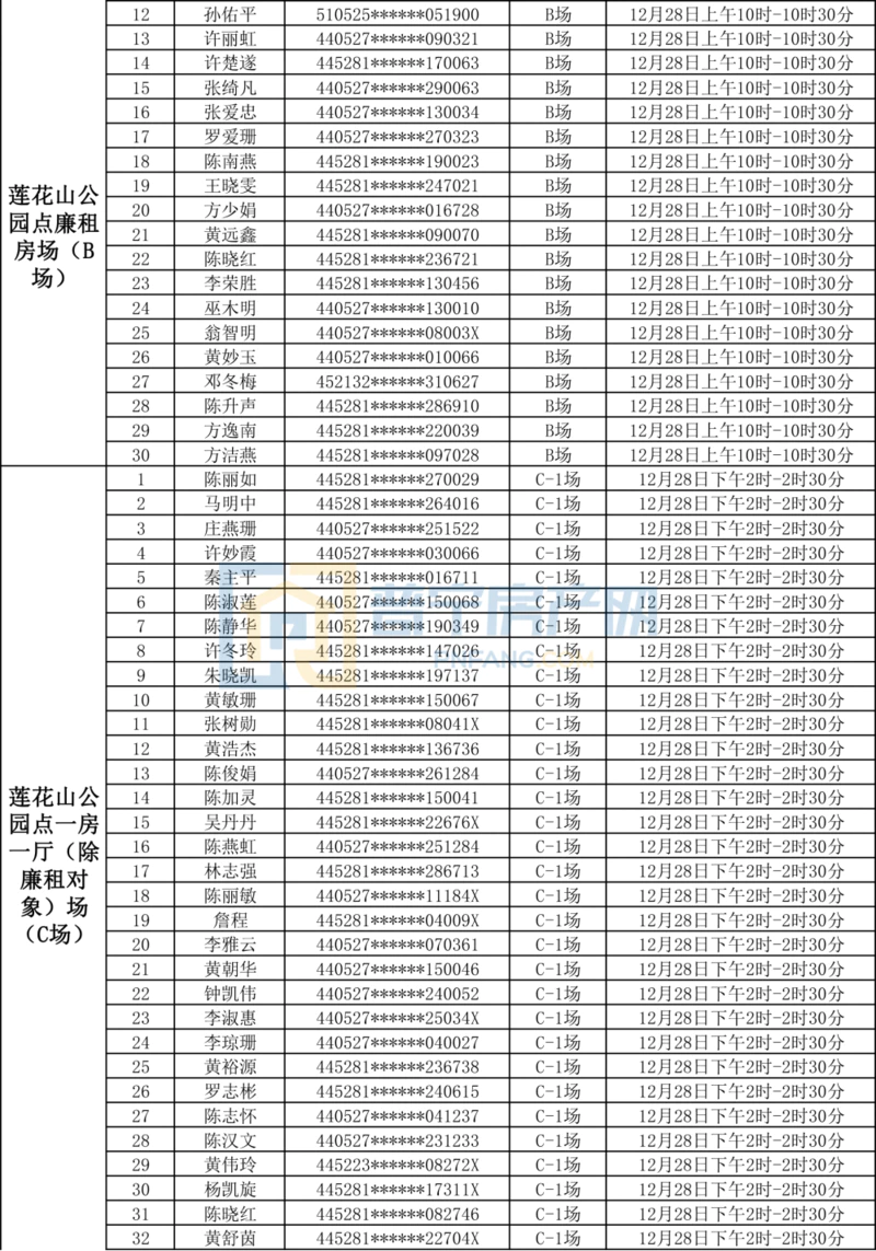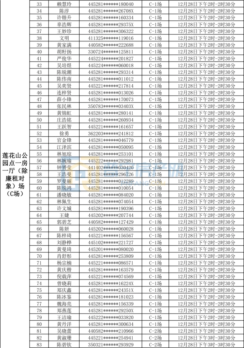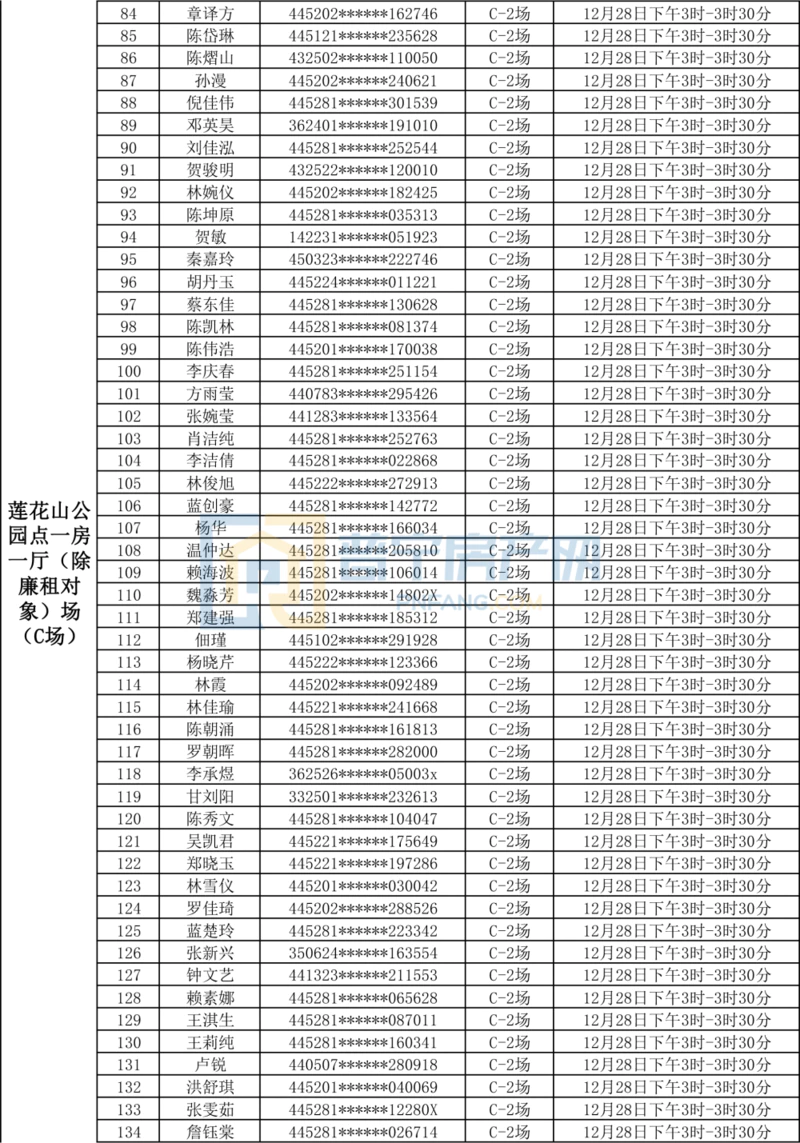 C场次为莲花山公园点一房一厅(除廉租房)房源抽签,且按人数分为C-1场和C-2场两个批次进行;