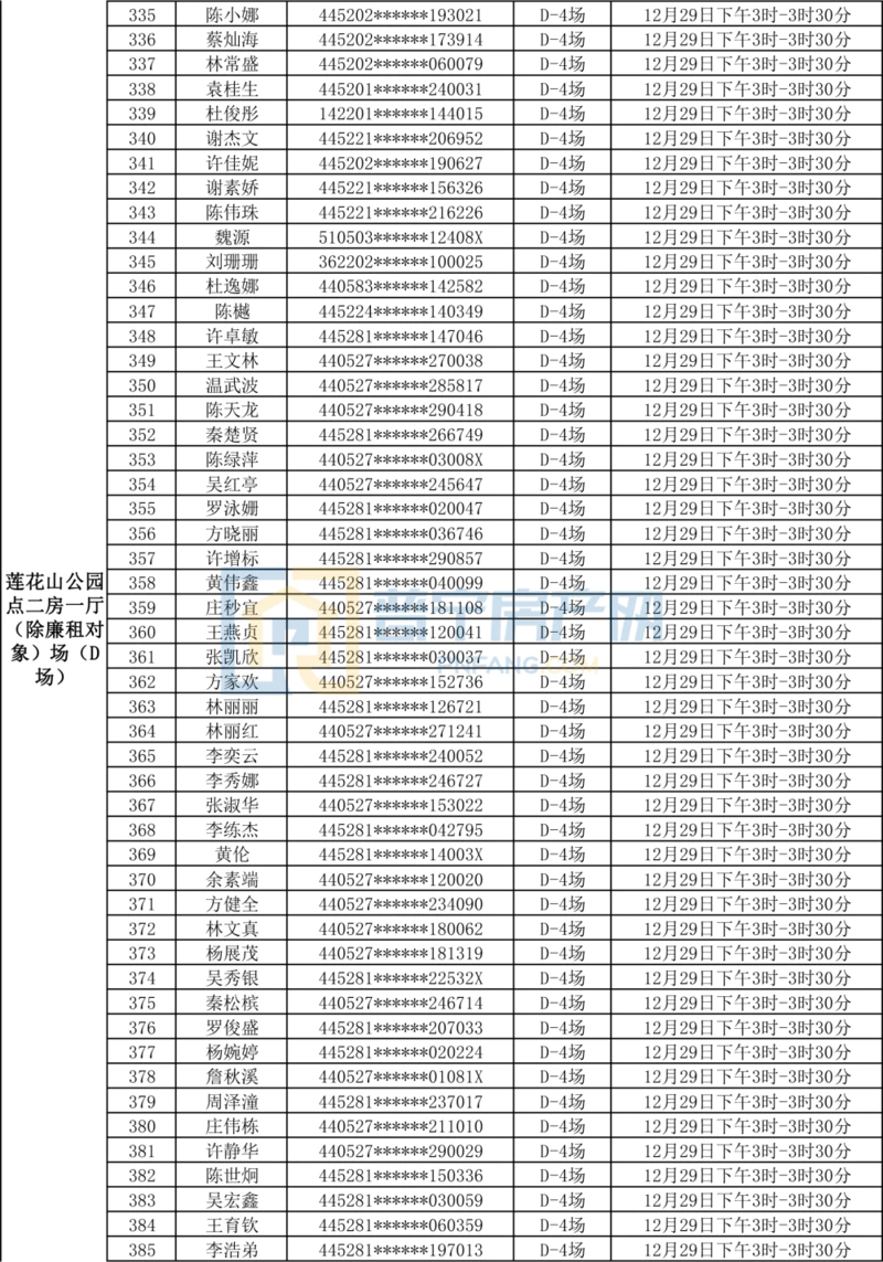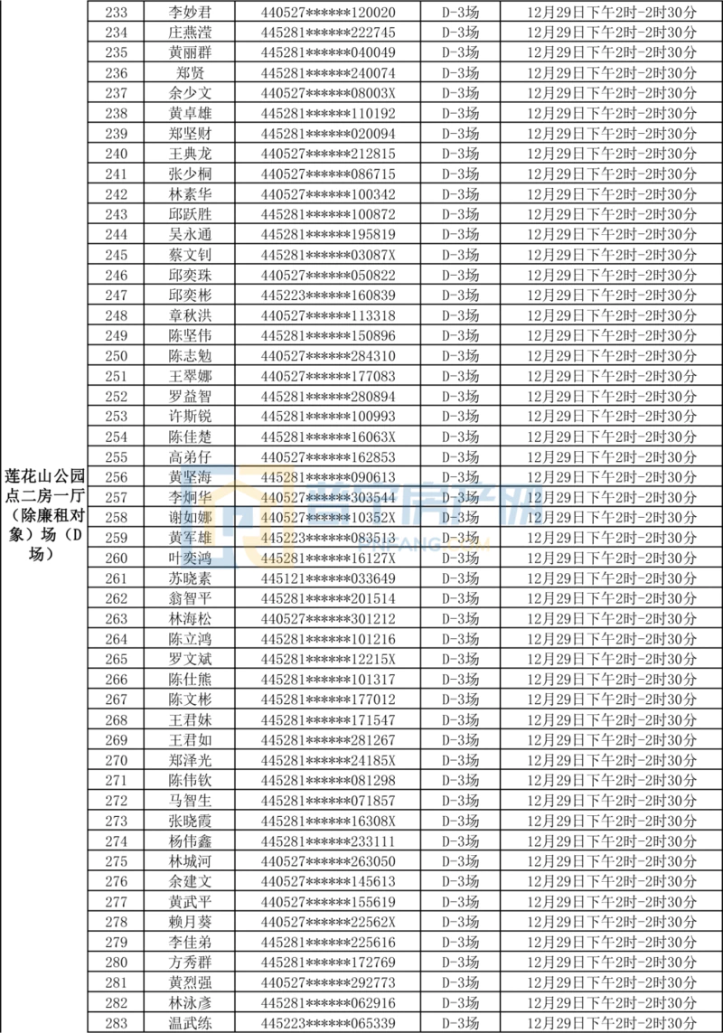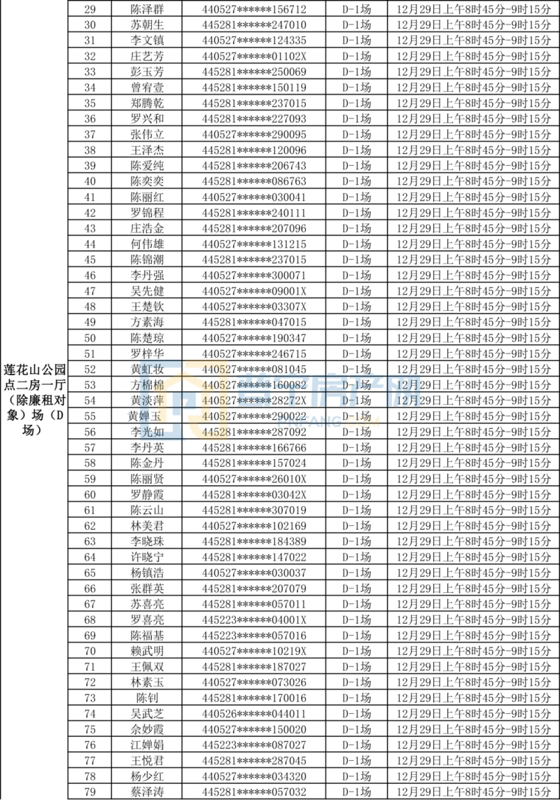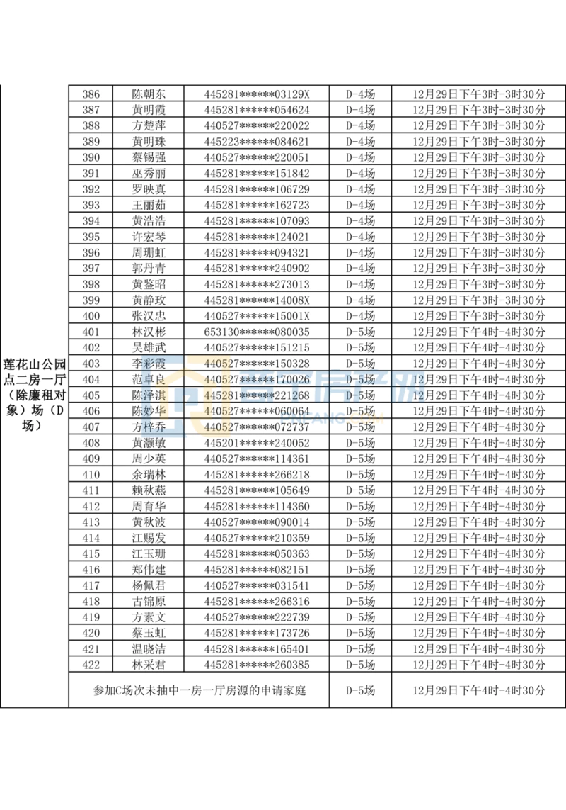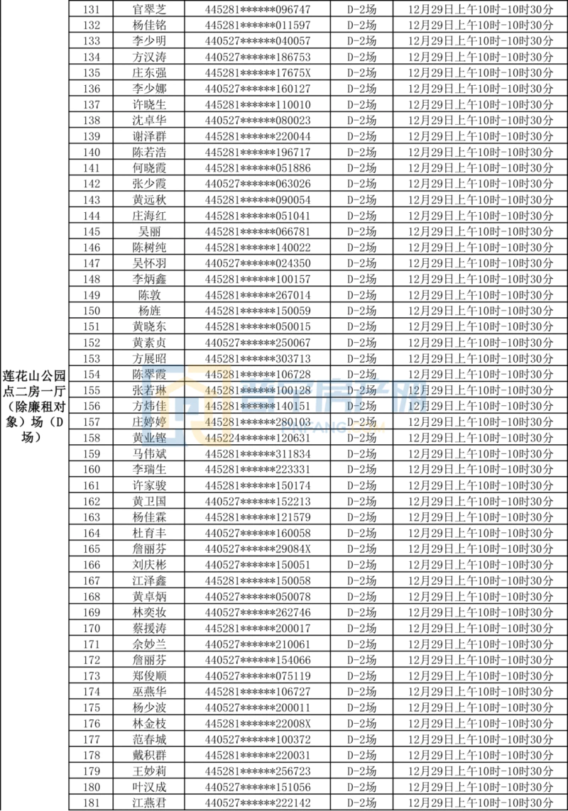 D-5场(安排63户):12月29日下午4时开始登记进场,抽签者应于4时30分前登记进场等候,4时45分开始抽签(包含参加莲花山公园点一房一厅房源抽签抽到空号的对象)。