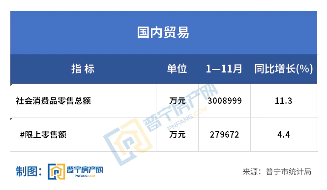 1-11月,全市实现社会消费品零售总额300.90亿元,增长11.3%,增速比去年同期加快22.7个百分点,两年平均下降0.7%。
