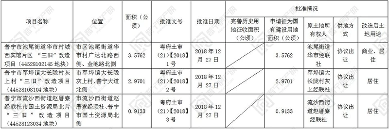 普宁市国土资源局公示了《普宁市“三旧”改造旧村庄建设用地征为国有建设用地的批复结果公告》,省人民政府已经批准我市3宗“三旧”改造旧村庄建设用地征为国有建设用地。