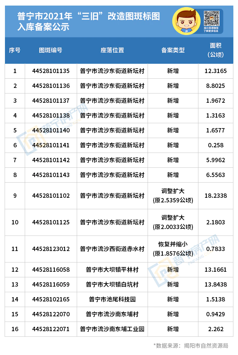 今天,揭阳市自然资源局发布了《揭阳市2021年“三旧”改造图斑标图入库备案公示》,共计34宗,其中涉及普宁16宗,合计总面积约1376.95亩,主要位于流沙东街道、流沙西街道、大坝镇、池尾(楼盘详情户型图相册地图)街道、流沙南街道。