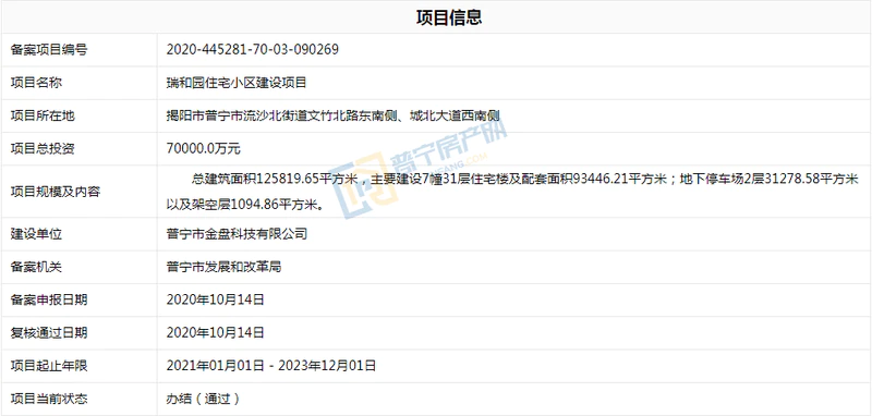 2020年10月,瑞和园住宅小区建设项目正式备案通过,总投资7亿元,由普宁市金盘科技有限公司建设,总建筑面积125819.65平方米,主要建设7幢31层住宅楼及配套面积93446.21平方米;地下停车场2层31278.58平方米以及架空层1094.86平方米。