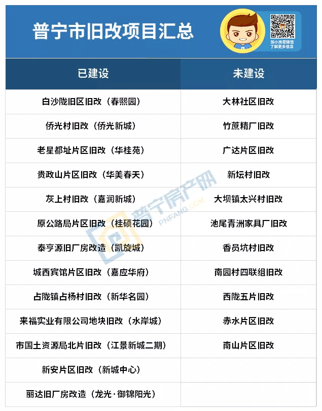 在2020年的政府工作报告中,曾提到要持续推进三旧改造,打造新坛三旧改造连片开发示范点,改造4个以上城镇老旧小区,打造美好宜居的景观风貌。在普宁十四五规划中,也提到了计划对普宁市市区白沙陇、新坛、新安、南园、赤水、赵厝寮、南山、华市、上寮(楼盘详情户型图相册地图)等城中村、老旧小区进行全面改造提质。