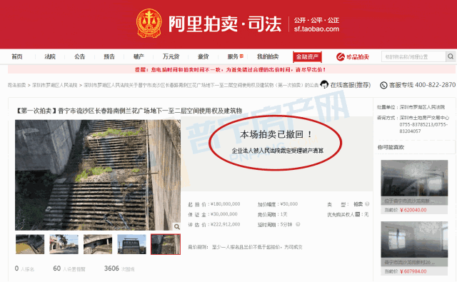 2018年6月,普宁兰花广场地下一至二层使用权曾公开进行拍卖,起拍价高达1.8亿元,建筑面积86000㎡,后因企业法人被人民法院裁定受理破产清算,拍卖被撤回。