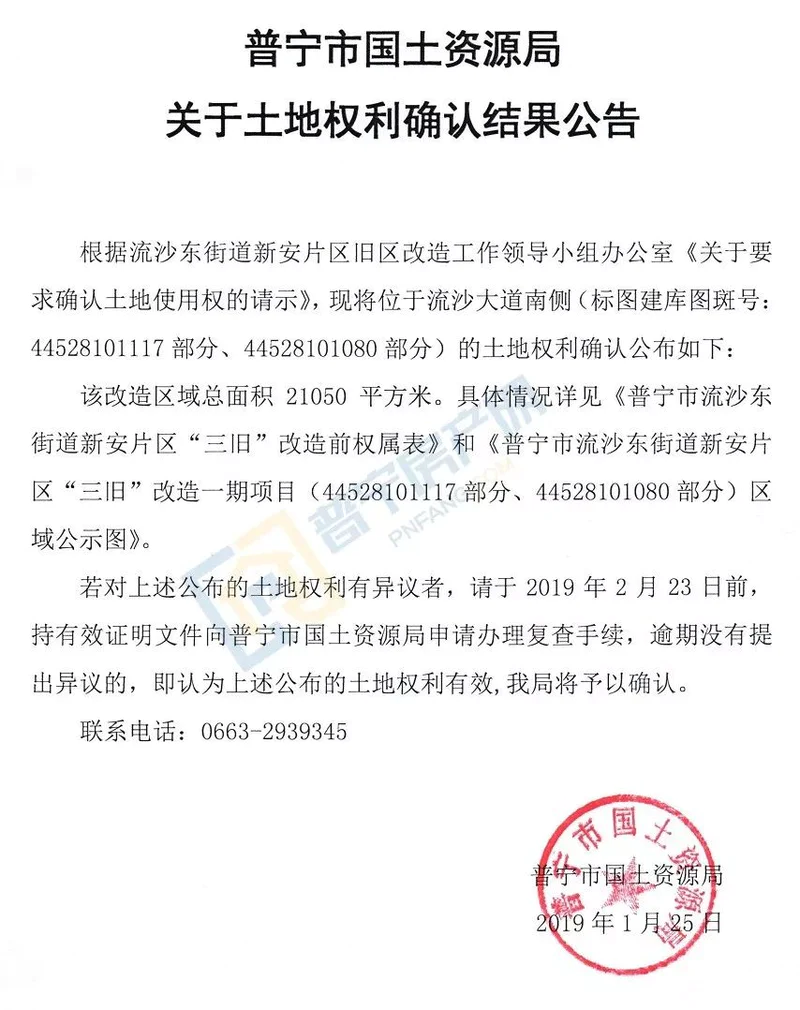 普宁市国土资源局对(新安片区)土地权利确认结果进行公告。