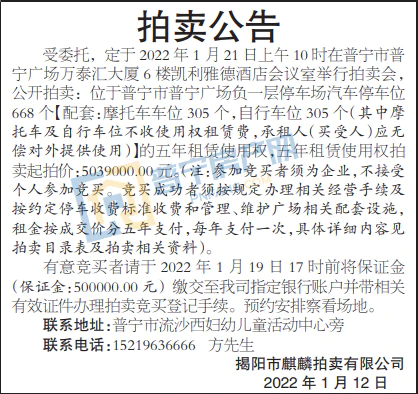 受委托,定于2022年1月21日上午10时在普宁市普宁广场万泰汇大厦6楼凯利雅德酒店会议室举行拍卖会,公开拍卖:位于普宁市普宁广场负一层停车场汽车停车位668个【配套:摩托车车位305个,自行车位305个(其中摩托车及自行车位不收使用权租赁费,承租人(买受人)应无偿对外提供使用)】的五年租赁使用权,五年租赁使用权拍卖起拍价:5039000.00元。(注:参加竞买者须为企业,不接受个人参加竞买。竞买成功者须按规定办理相关经营手续及按约定停车收费标准收费和管理、维护广场相关配套设施,租金按成交价分五年支付,每年支付一次,具体详细内容见拍卖目录表及拍卖相关资料)。