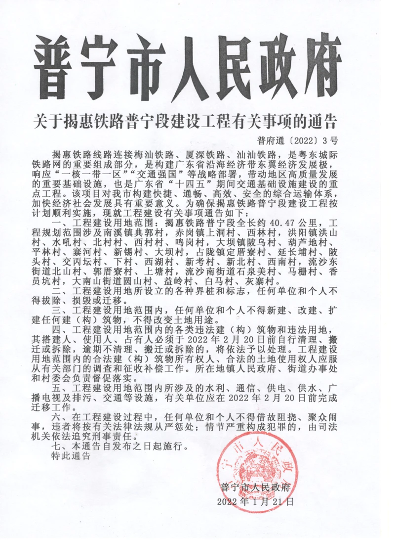 近日普宁市人民政府也发布了《关于揭惠铁路普宁段建设工程有关事项的通告》,为确保揭惠铁路普宁段建设工程按计划顺利实施,工程建设用地范围内的各类违法建(构)筑物和违法用地, 其搭建人、使用人、占有人必须于2022年2月20日前自行清理、搬迁或拆除,逾期不清理、搬迁或拆除的,将依法予以处理。