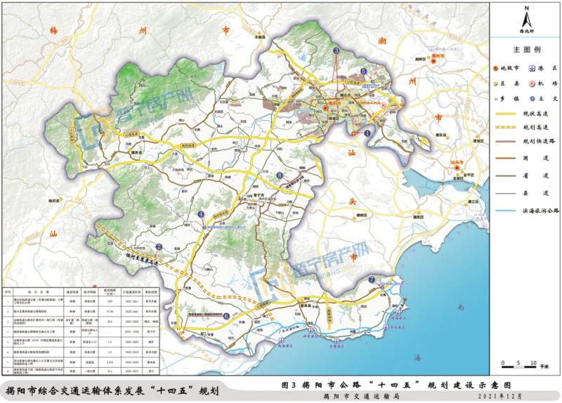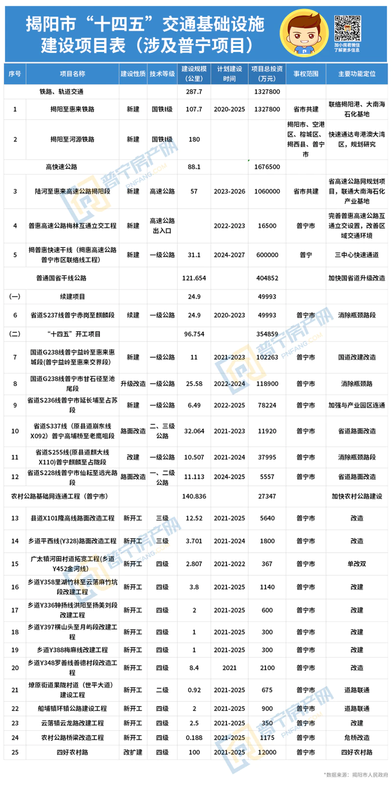 近日,《揭阳市综合交通运输体系发展“十四五”规划》已经市人民政府第六届109次常务会议审议通过。据小房君统计,普宁有25个项目被列入揭阳市“十四五”交通基础设施建设项目,涉及铁路、轨道交通、高快速公路、普通国省干线公路以及农村公路基础网连通工程,总投资3436499万元,建设规模638.29公里。具体内容如下: