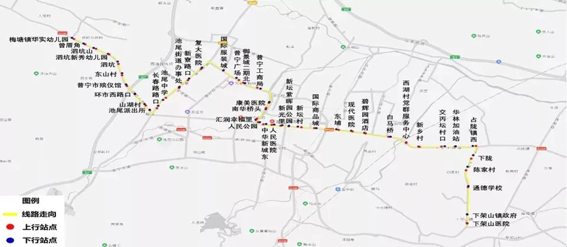 途经站点:梅塘镇华实幼儿园-曾厝角-泗坑村-东山村-环市西路口-山湖村-池尾(楼盘详情户型图相册地图)派出所-长春路路口-池尾街道办事处-新寮村路口-乌石(楼盘详情户型图相册地图)村-国际服装城-普宁广场-市场监督管理局-康美医院-汇润幸福里-中华新城东-人民医院-新光里-新坛紫晖园(楼盘详情户型图相册地图)公园-新坛村-国际商品城-东埔村-现代医院-碧辉园酒店-白马桥-西湖村党群服务中心-新乡村-交丙坛村口-华林加油站-下陇村-陈家村-通德学校-下架山镇政府-下架山医院