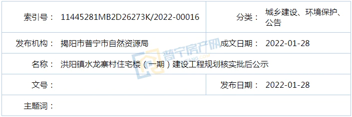 近日,普宁市自然资源局发布了洪阳镇水龙寨村住宅楼(一期)建设工程规划核实批后公示,已给予洪阳镇水龙寨村住宅楼(一期)建设工程竣工规划核实(验收),总建筑面积103052.08平方米,具体内容如下: