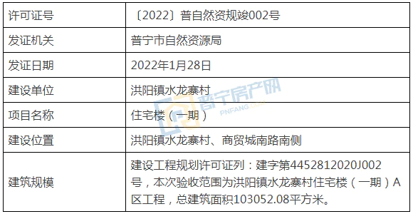 建筑规模:建设工程规划许可证列:建字第4452812020J002号,本次验收范围为洪阳镇水龙寨村住宅楼(一期)A区工程,总建筑面积103052.08平方米。