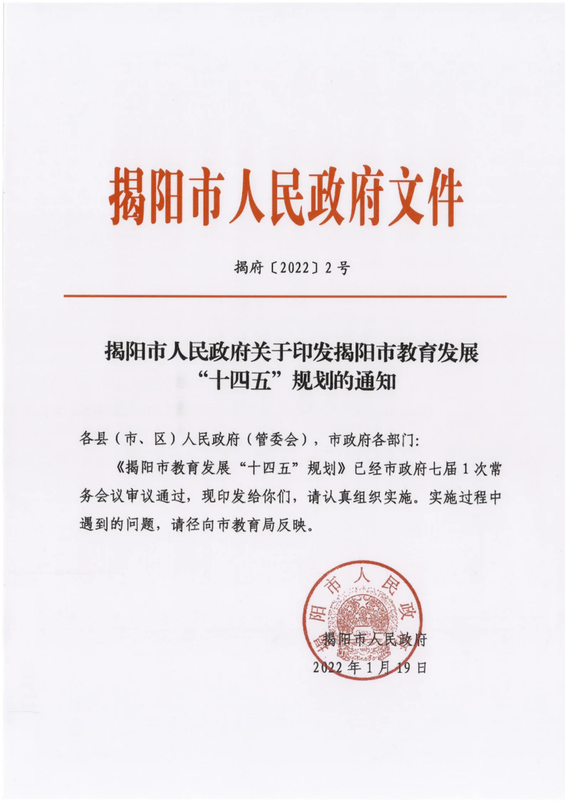 近日,揭阳市人民政府发布了关于印发揭阳市教育发展“十四五”规划的通知,出台《揭阳市教育发展“十四五”规划》,是揭阳市贯彻落实党的十九大精神和全国、全省、全市教育大会精神,建设高质量教育体系、加快教育现代化、建设教育强市的重要举措。该规划被列为揭阳市重点专项规划,是未来五年教育发展的纲领性文件。