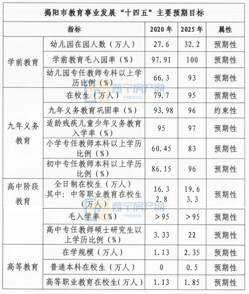 到2025年,揭阳全市学前教育毛入学率达到100%以上,幼儿园专任教师专科以上学历比例达到93%;九年义务教育巩固率达到96%,残疾儿童少年义务教育入学率达到97%,小学专任教师本科以上学历比例达到83%,初中专任教师本科以上学历比例达到96%;高中阶段毛入学率达到95%以上,高中专任教师硕士研究生以上学历比例达到22%。实现各级各类教育更加公平、更高质量、更有特色,建成满足全民终身学习需要的现代教育体系,教育服务与引领经济社会转型发展能力显著增强,教育治理效能全面提升,全市教育综合实力、整体竞争力基本达到全省平均水平。