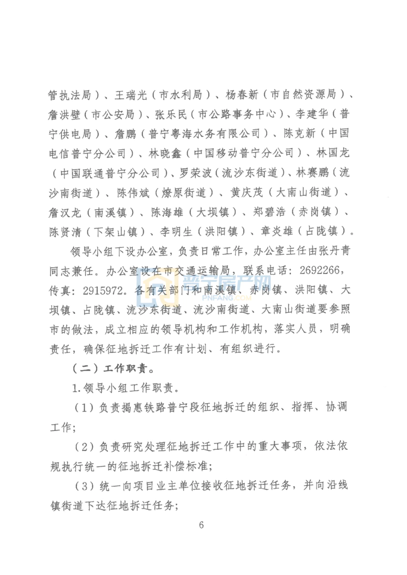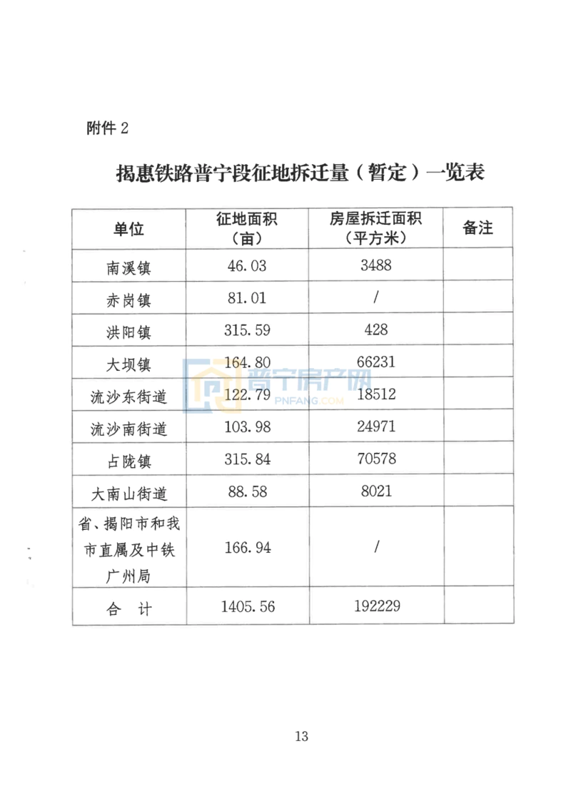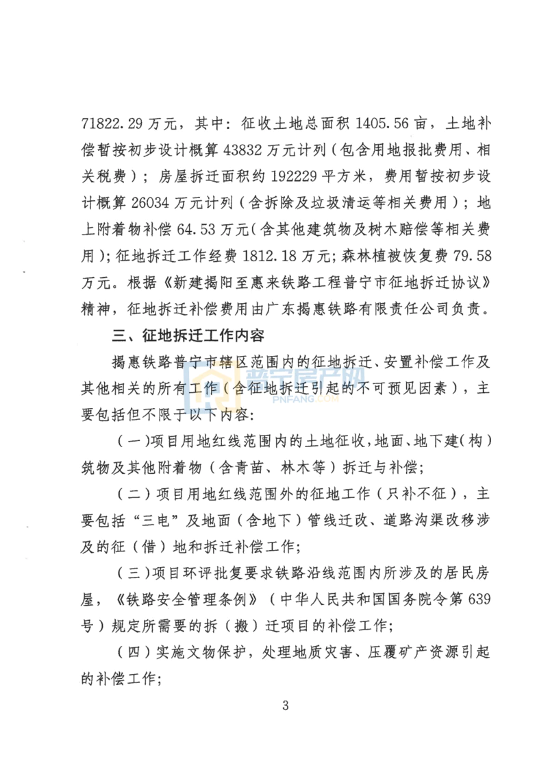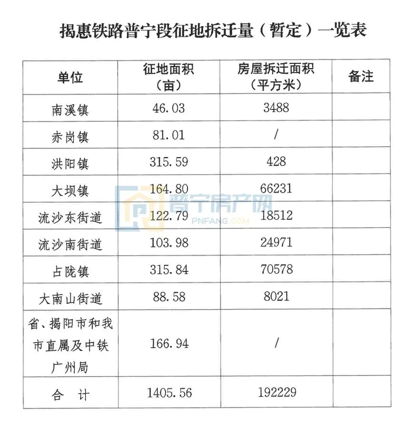 据了解,新建揭阳至惠来铁路普宁市境内线路全长40. 47公里,涉及征地拆迁范围包括:南溪镇、赤岗镇、洪阳镇、大坝镇、占陇镇、流沙东街道、流沙南街道、大南山(楼盘详情户型图相册地图)街道等8个镇街道,概算征地拆迁补偿暂定总费用为71822.29万元,其中:征收土地总面积1405. 56亩,土地补偿暂按初步设计概算43832万元计列(包含用地报批费用、相关税费);房屋拆迁面积约192229平方米,费用暂按初步设计概算26034万元计列(含拆除及垃圾清运等相关费用);地上附着物补偿64. 53万元(含其他建筑物及树木赔偿等相关费用);征地拆迁工作经费1812. 18万元;森林植被恢复费79. 58万元。根据《新建揭阳至惠来铁路工程普宁市征地拆迁协议》精神,征地拆迁补偿费用由广东揭惠铁路有限责任公司负责。