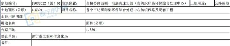 另外还有一宗国有土地划拨用地批前公示,位于占麟公路西侧、汕湛高速北侧,土地面积约23亩,用于建设普宁市纺织印染环保综合处理中心纺织西路及配套工程。具体内容如下: