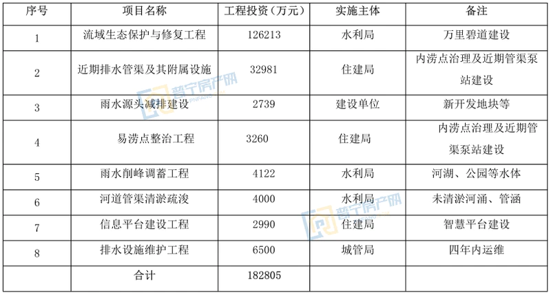 本轮城市内涝治理实施方案,重点考虑近五年的系统建设内容,提升中心城区的防洪排涝能力,因此,远期建设工程未纳入在工程总投资内。建设内容主要包括流域生态保护与修复工程、近期排水管渠及其附属设施、雨水源头减排、易涝点整治工程、雨水削峰调蓄工程、河道管渠清淤疏浚、信息平台建设工程、排水设施维护工程八项内容,工程总投资合计182805万元。