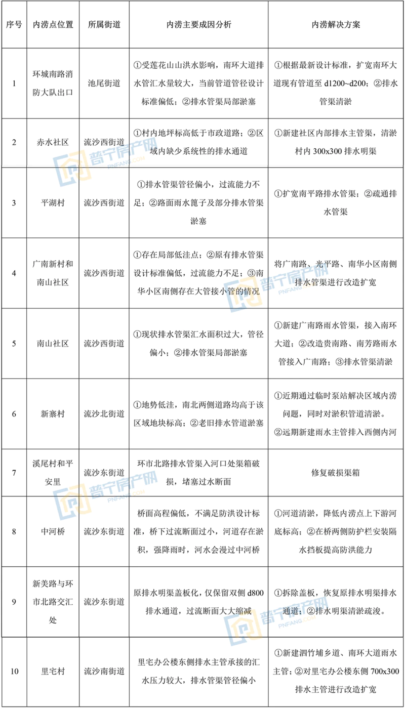 根据区住建局和各街道反映及现场调研走访,普宁市中心城区10处易涝点主要分布于8个街道,其中池尾(楼盘详情户型图相册地图)街道1处,流沙西街道4处,流沙北街道1处,流沙东街道3处,流沙南街道1处,具体分布及解决方案、现场照片如下。