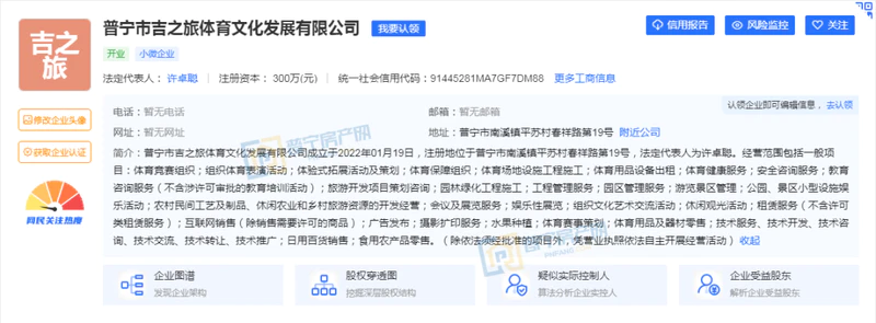 据了解,普宁市吉之旅体育文化发展有限公司成立于2022年01月19日,注册地位于普宁市南溪镇平苏村春祥路第19号,注册资本300万。经营范围包括一般项目:体育竞赛组织;组织体育表演活动;体验式拓展活动及策划;体育保障组织;体育场地设施工程施工;体育用品设备出租;体育健康服务;安全咨询服务;教育咨询服务(不含涉许可审批的教育培训活动);旅游开发项目策划咨询;园林绿化工程施工;工程管理服务;园区管理服务;游览景区管理;公园、景区小型设施娱乐活动;农村民间工艺及制品、休闲农业和乡村旅游资源的开发经营;会议及展览服务;娱乐性展览;组织文化艺术交流活动;休闲观光活动;租赁服务(不含许可类租赁服务);互联网销售(除销售需要许可的商品);广告发布;摄影扩印服务;水果种植;体育赛事策划;体育用品及器材零售;技术服务、技术开发、技术咨询、技术交流、技术转让、技术推广;日用百货销售;食用农产品零售。(除依法须经批准的项目外,凭营业执照依法自主开展经营活动)