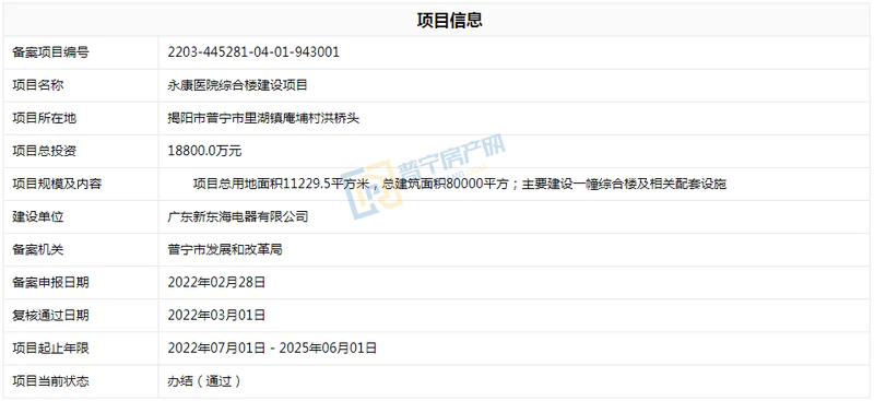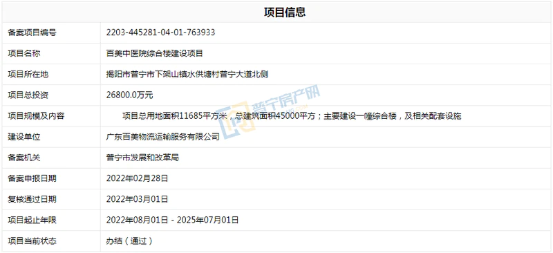 近日,据小房君了解,普宁一批项目启动公示,合计约69.8亩,包括备案、设计方案、批前公示等,涉及百美中医院综合楼建设项目、百美康养中心综合楼建设项目、永康医院综合楼建设项目、普宁末站—纺织印染园区能源站天然气管线建设工程、普宁市华润中宏能源有限公司建设用地规划许可,具体内容如下: