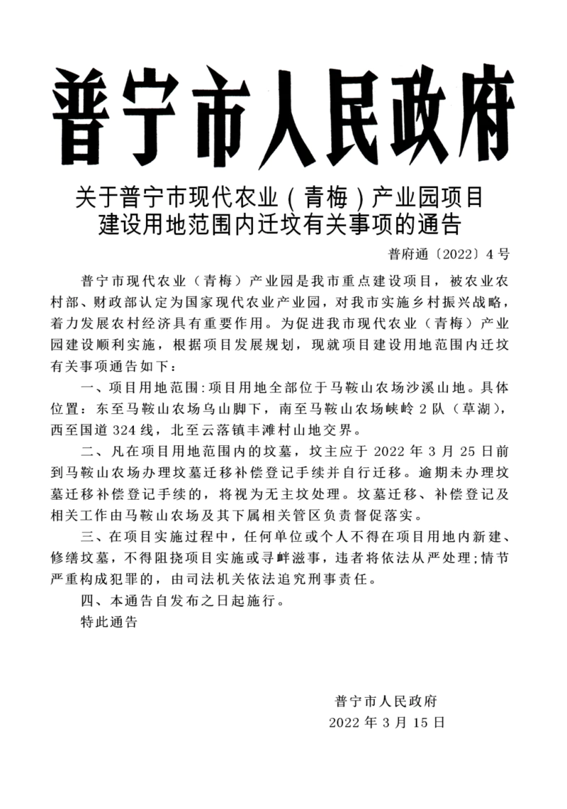 近日,普宁市人民政府发布了关于普宁市现代农业(青梅)产业园项目建设用地范围内迁坟有关事项的通告。通告提出,为促进我市现代农业(青梅)产业园建设顺利实施,凡在项目用地范围内的坟墓,坟主应于2022年3月25日前到马鞍山农场办理坟墓迁移补偿登记手续并自行迁移。具体内容如下: