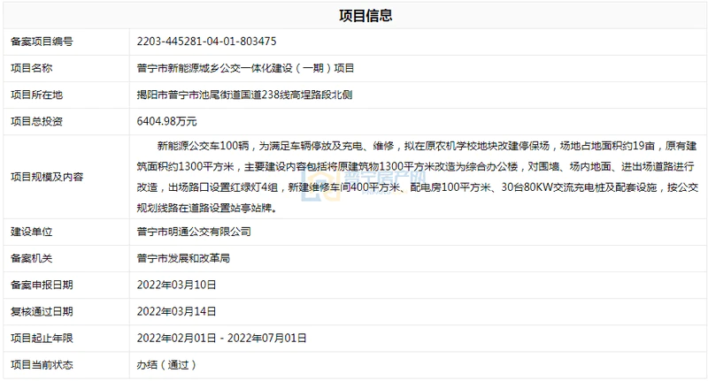 项目名称:普宁市新能源城乡公交一体化建设(一期)项目