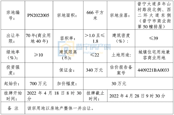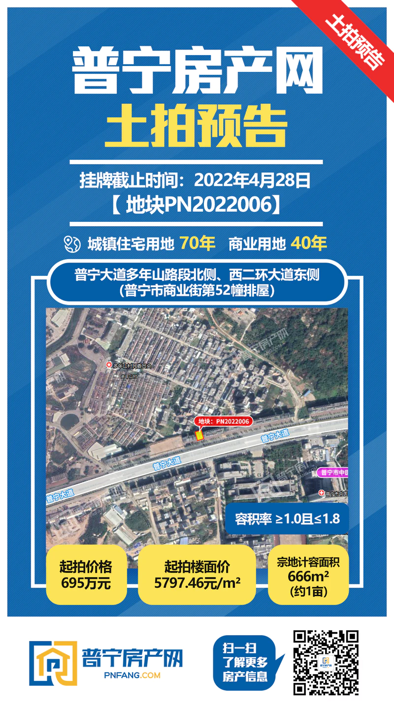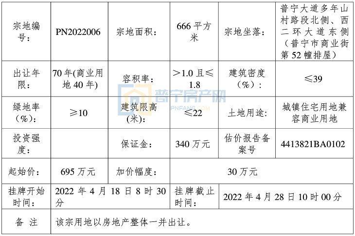 据悉,PN2022005、PN2022006地块一二层作为商业经营场地,土地出让年限40年,三层及以上作为住宅用地,土地出让年限70年,宗地成交后,房地产一并移交。土地按现状交付使用,周边各种配套以现状为准。地块所有建设内容应严格按照《普宁商业街第50幢排屋地块规划条件》、《普宁商业街第52幢排屋地块规划条件》规定执行。