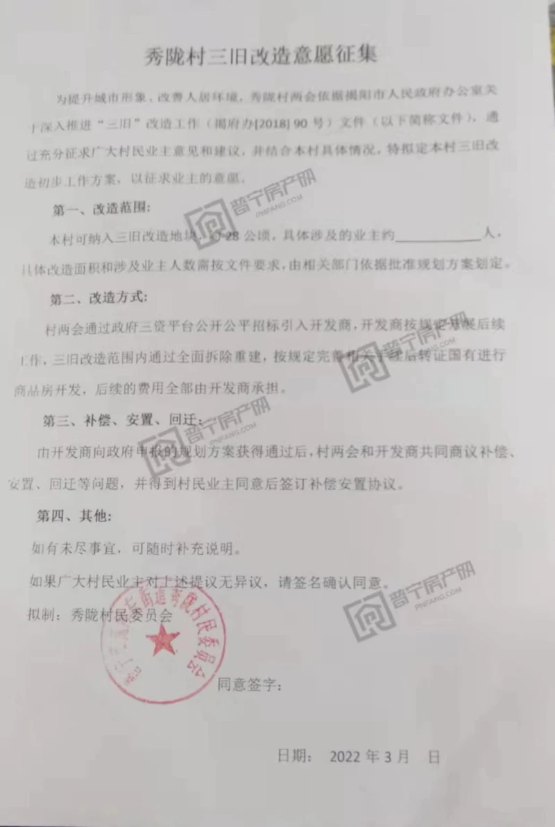 为提升城市形象,改善人居环境,秀陇村两会依据揭阳市人民政府办公室关于深入推进“三旧”改造工作(揭府办[2018]90号)文件(以下简称文件),通过充分征求广大村民业主意见和建议,并结合本村具体情况,特拟定本村三旧改造初步工作方案,以征求业主的意愿。