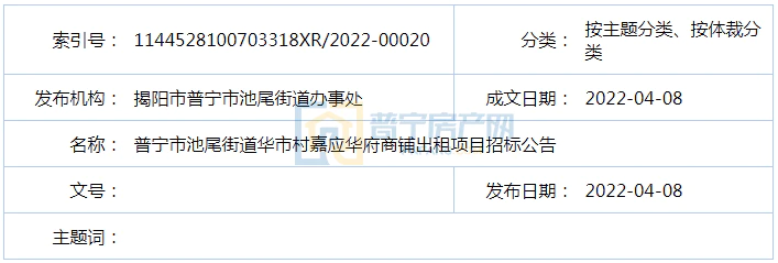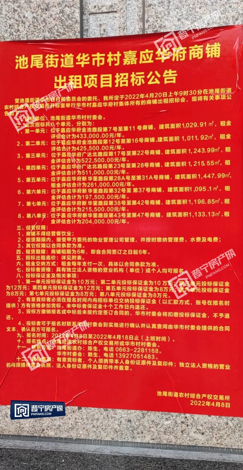 普宁市池尾街道华市村嘉应华府商铺出租项目招标公告