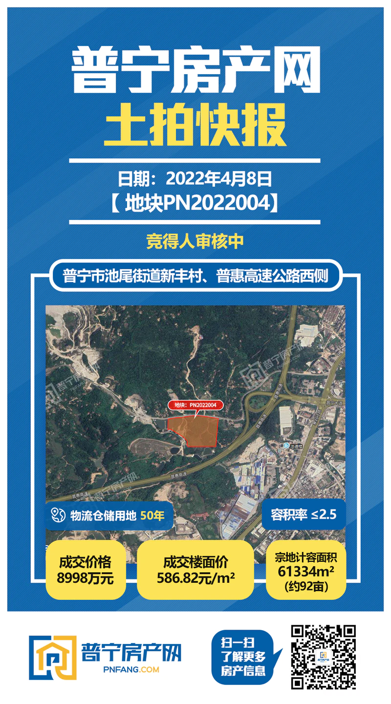 PN2022004地块以8998万成交,成交楼面价586.82元/㎡,地块位于普宁市池尾街道新丰村、普惠高速公路西侧,占地面积61334平方米,为50年物流仓储用地。