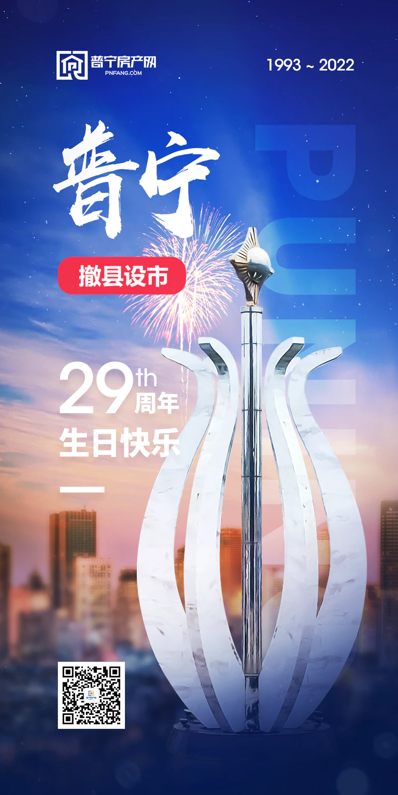 普宁于明嘉靖四十二年(1563年)置县,初始县衙暂寄于潮阳贵屿民宅;万历十四年(1586年)县治迁于洪阳;1949年7月1日,普宁县人民政府成立,定县城于流沙;1993年4月6日,撤县设市,由省直辖、揭阳市代管。