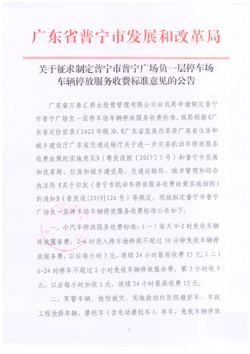 广东省万泰汇商业经营管理有限公司向我局申请制定普宁市普宁广场负一层停车场车辆停放服务收费标准。我局根据《广东省定价目录(2022年版)》、《广东省发展改革委广东省住房和城乡建设厅广东省交通运输厅关于进一步完善机动车停放服务收费政策的实施意见》(粤发改规[2017]5号)和普宁市发展和改革局、住房和城乡建设局、交通运输局、城市管理和综合执法局《关于印发《普宁市机动车停放服务收费政策实施细则》的通知》(普发改[2019]126号)等规定,现就拟定普宁市普宁广场负一层停车场车辆停放服务收费标准公告如下: