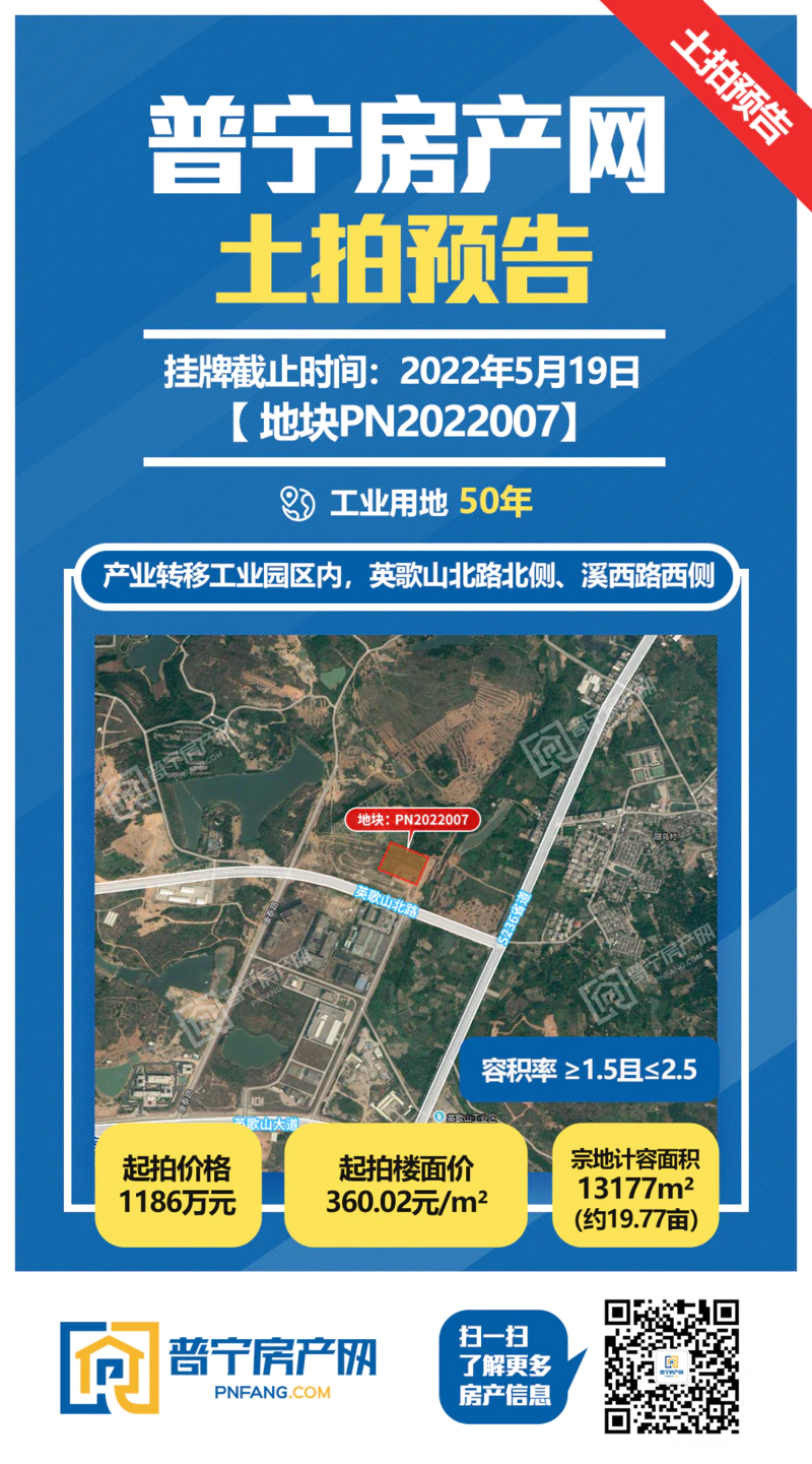 据了解,PN2022007地块拟引进“中药饮片生产基地”产业项目,竞买人在竞买前须与普宁市英歌山工业园管理委员会签订《投资合作框架协议书》。项目建设须符合《揭阳市人民政府关于落实“三贡献一高一强”推动重点产业园区高质量发展的意见》、《普宁产业转移工业园招商引资若干措施》的相关要求,该宗地的项目投资规模≥5000万元,投资强度≥320万元/亩,建成投产后前二个完整会计年度亩均年产值≥200万元,亩均财税贡献≥10万元;投产后第三个完整会计年度起,亩均年产值≥300万元,亩均财税贡献≥18万元。