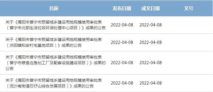 《审批表》于2022年4月2日通过揭阳市自然资源局审批(4452002022JY012)。落实地块面积4.0000公顷,落实前,落实地块土地利用规划地类为农用地3.7891公顷(均为园地),其他土地0.2109公顷。落实后,落实地块全部调整为规划城乡建设用地。
