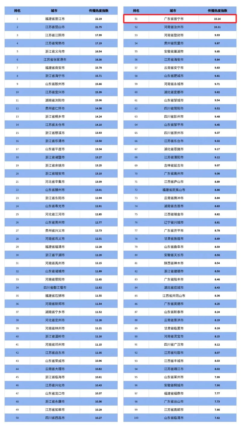 近日,2022全国城市传播热度指数揭晓,广东普宁、高州、开平、陆丰、英德、台山等6市上榜全国县级市传播指数前100名单,其中普宁市排省内第一。