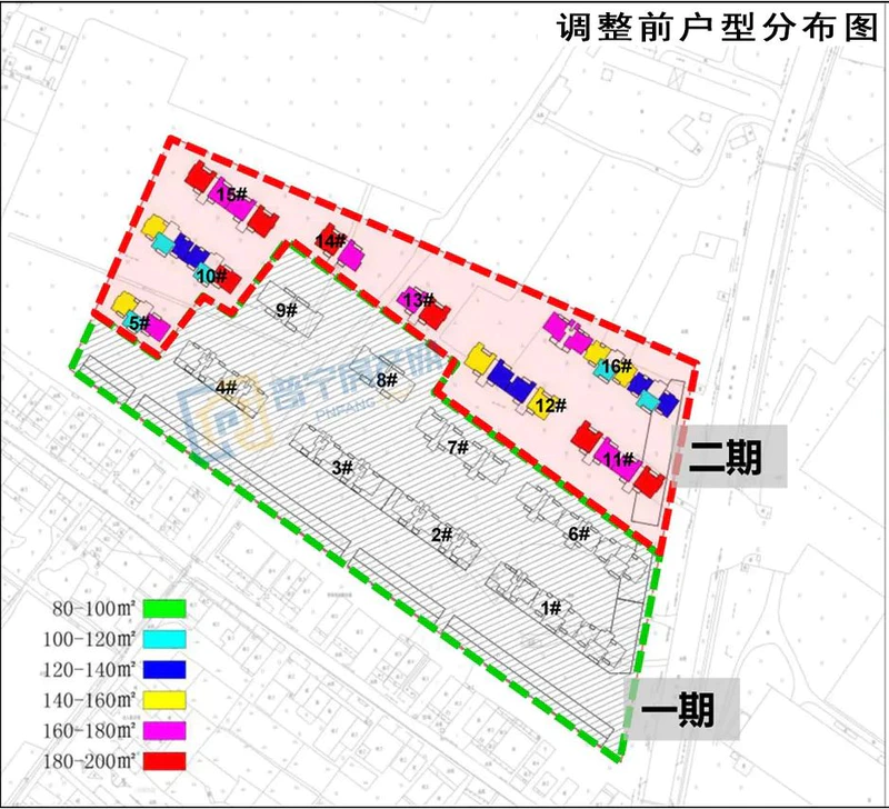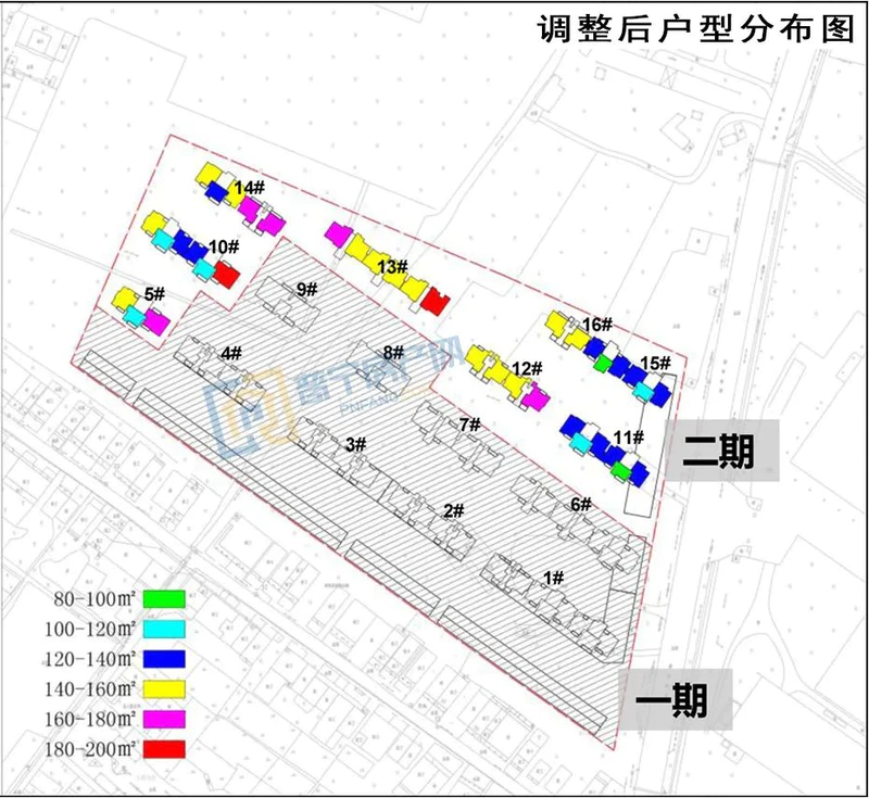 优化调整项目二期中的11#--16#(共6幢)建筑布局以及户型,将多数180-200㎡大户型调整为120-160㎡户型,局部单元一梯两户改为一梯三户户型;建筑密度、容积率指标略为降低,绿地率、建筑高度指标保持不变,主要数据变化内容为总建筑面积增加2781. 68㎡、计容建筑面积减少19. 23㎡,停车位增加454个(其中地面增加359个)、户数增加111户,调整后规划技术指标均符合原规划设计条件要求。