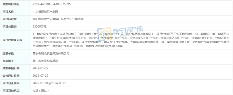 建设规模及内容:本项目总部(工商注册地:普宁市云落镇红光村1号广汕公路西侧A幢首层),项目计划征用工业工地600亩,分二期建设。第一期项目总建筑面积161300平方米,实验楼6000平方米,综合办公楼及宿舍5000平方米,冷链车间50000平方米,恒温车间20000平方米,冻库8000平方米,仓储20000平方米,成品包装车间7000平方米等。项目主要配套水、电及按SC生产场地、无菌车间标准要求装修厂房、实验室等公用工程,对农副产品等大健康产品高技术规模化生产,达到年产预制菜15000吨、植物及动物蛋白饮品10000吨。