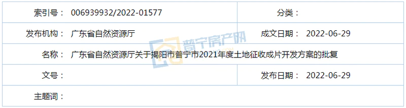 《揭阳市人民政府关于审批〈揭阳市普宁市2021年度土地征收成片开发方案〉的请示》(揭府〔2022〕23号)收悉。根据《中华人民共和国土地管理法》第四十五条规定,经省人民政府同意,现批复如下: