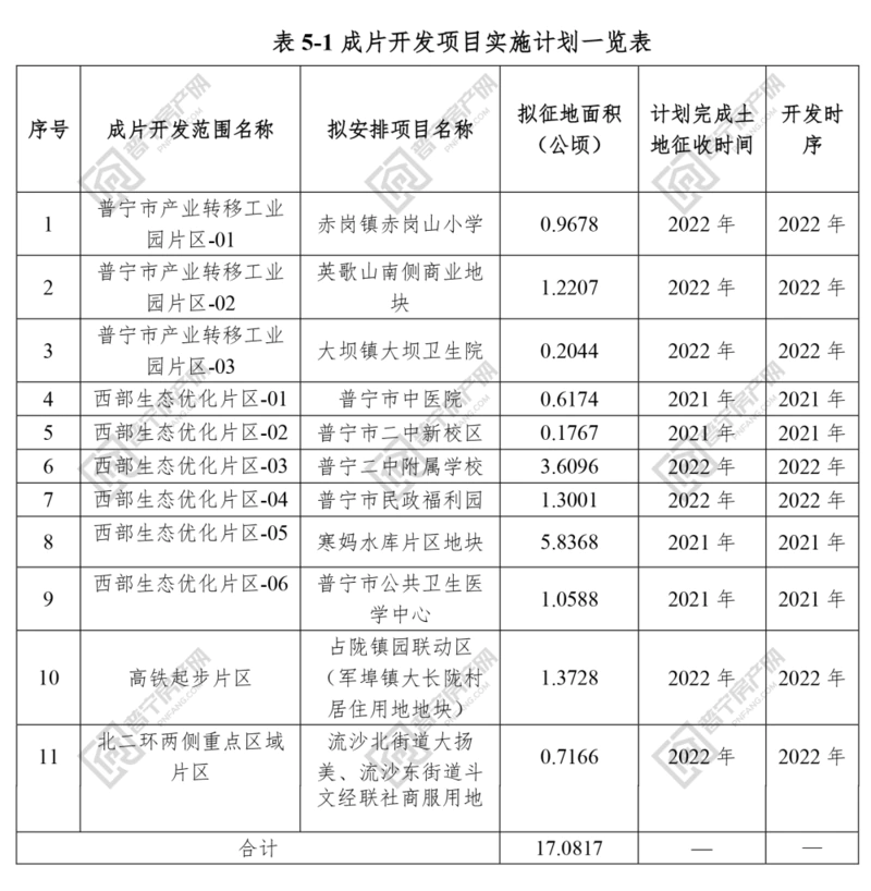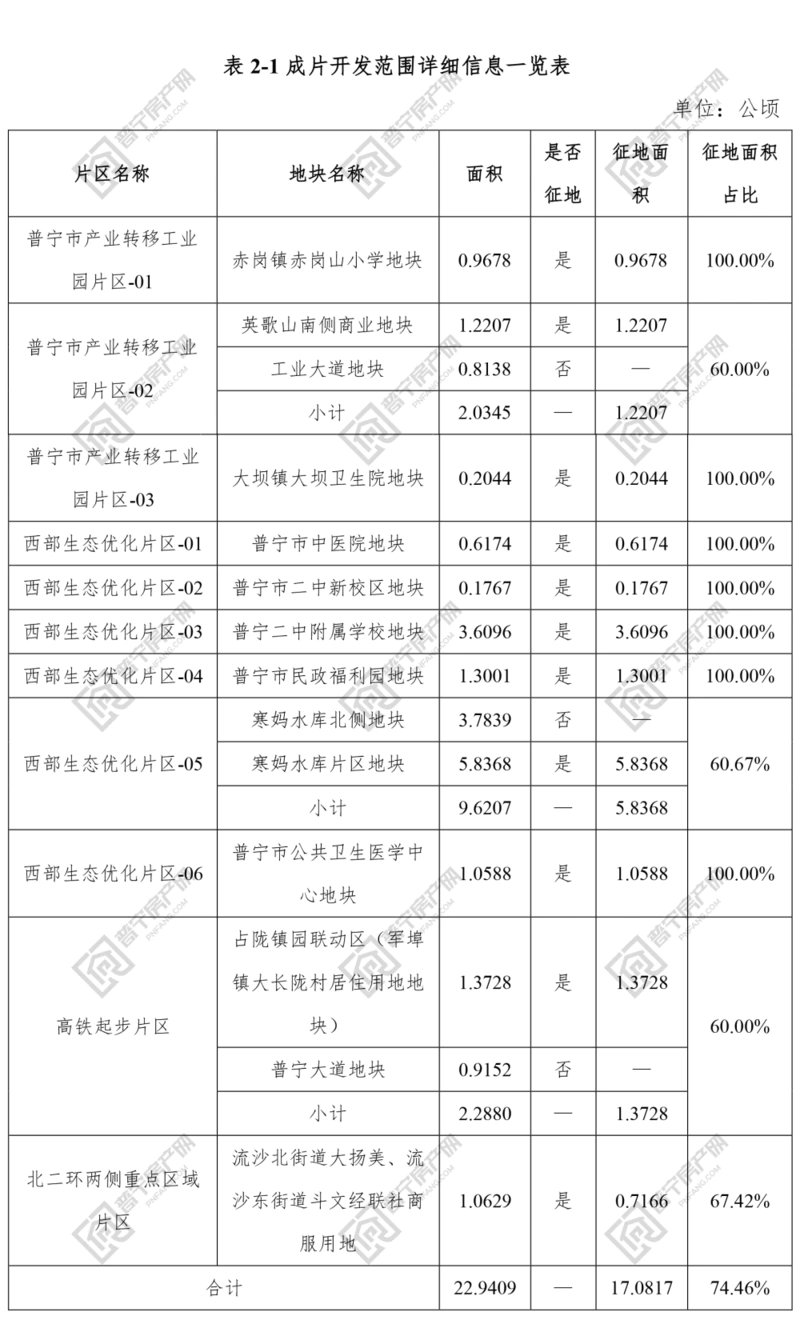 本次普宁市土地征收成片开发范围总面积22.9409公顷,其中拟征收范围面积17.0817公顷,征地面积占成片开发总面积的74.46%。成片开发范围共包含11个片区,具体如下表所示: