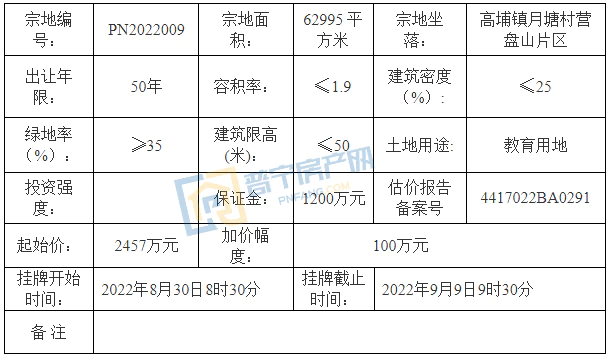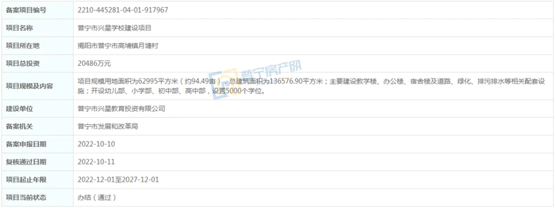 普宁市兴星学校项目于今年9月9日成功出让,PN2022009地块占地面积62995平方米,以2457万由普宁市兴星教育投资有限公司成功竞得,成交楼面价205.28元/㎡,为50年教育用地。