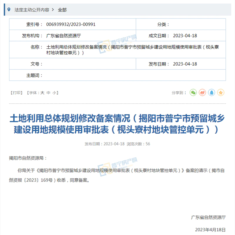 你局关于《揭阳市普宁市预留城乡建设用地规模使用审批表(枧头寮村地块管控单元)》备案的请示(揭市自然资报〔2023〕169号)收悉,同意备案。