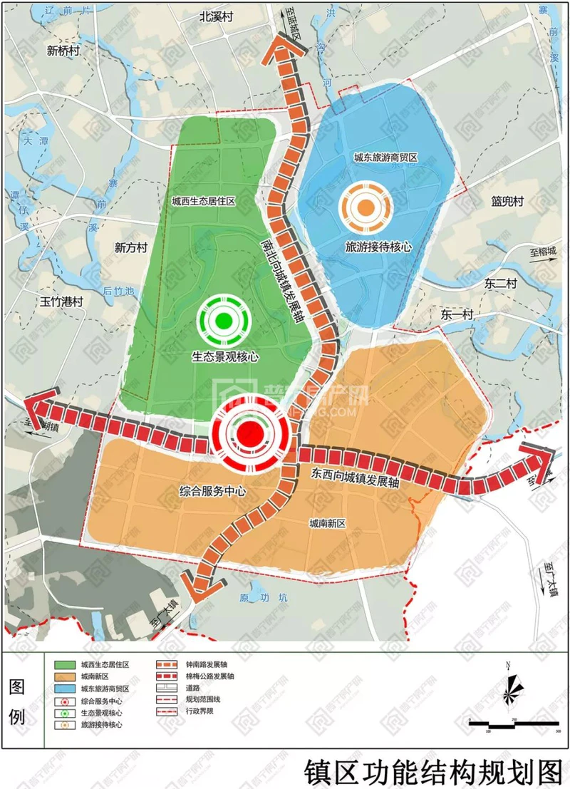 (3)两轴:东西向城镇发展轴,南北向城镇发展轴。两轴是镇区的交通发展主轴,也是镇域的经济产业发展轴线,十字交汇串联了三个功能片区。