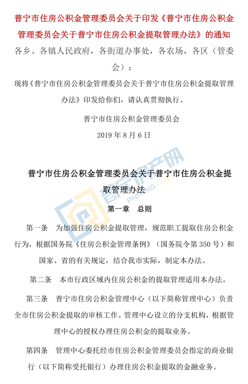 近日,普宁市住房公积金管理委员会印发了《普宁市住房公积金管理委员会关于普宁市住房公积金提取管理办法》的通知,该办法自2018年12月29日起施行,有限期至2023年12月28日。