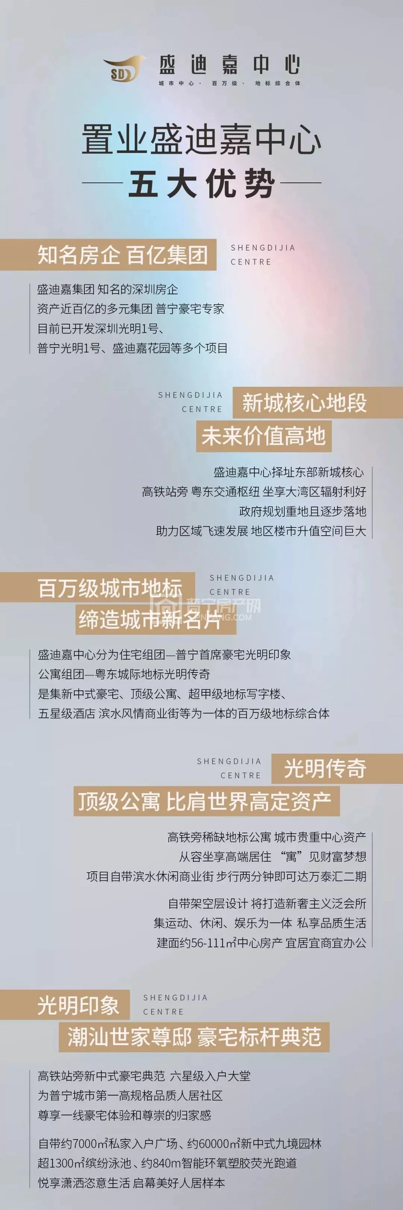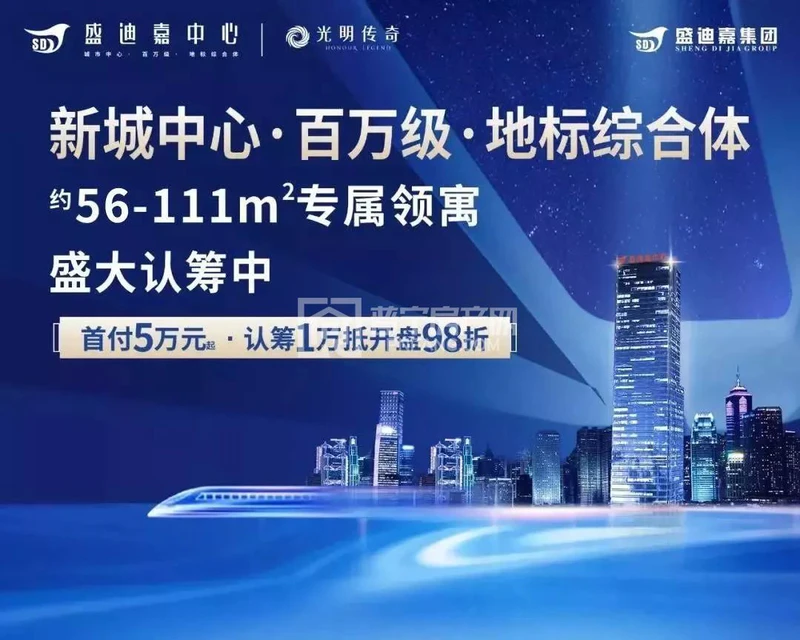 盛迪嘉中心·光明传奇——200米粤东天际地标建筑群,是由两栋现代化高端公寓和一栋200米超甲级地标写字楼组成,为普宁乃至粤东城际第一高楼,未来将成就高铁站旁国际级商务地标,领跑普宁新中心商业,成为普宁未来的高铁站旁CBD区域中心地标。