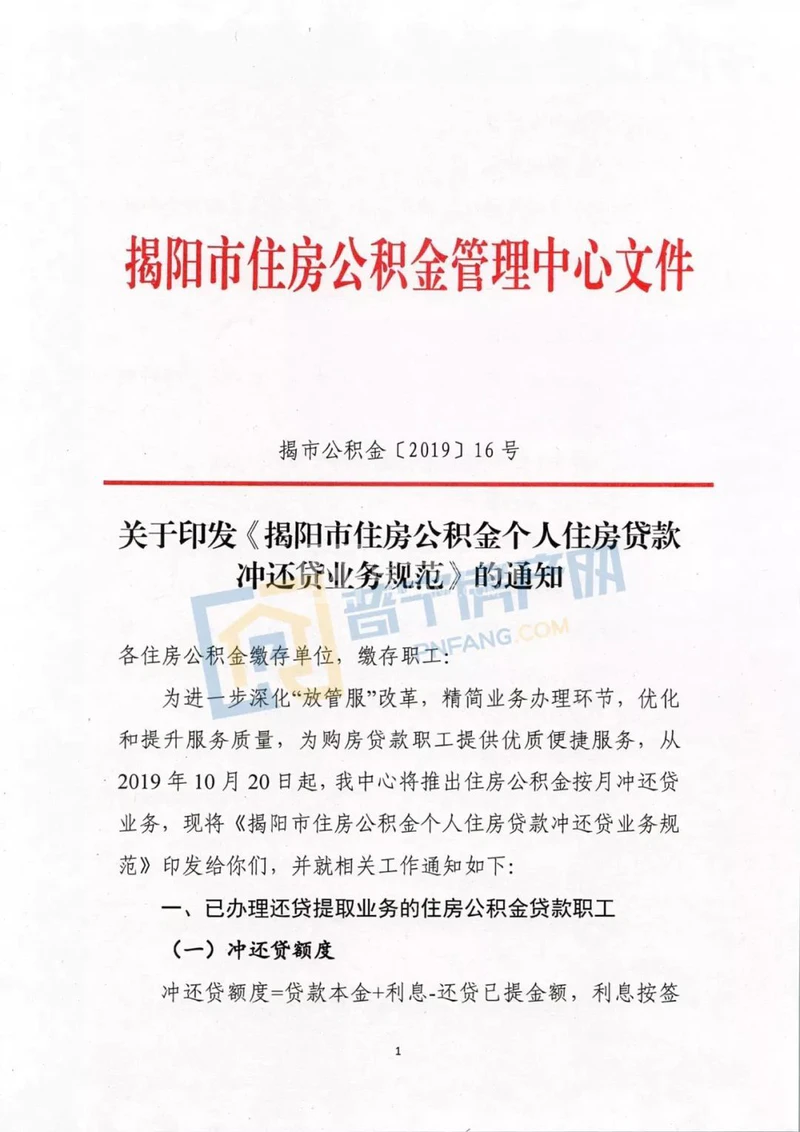 近日,揭阳市住房公积金管理中心发布了《揭阳市住房公积金个人住房贷款冲还贷业务规范》的通知。据通知显示,从2019年10月20日起,揭阳市住房公积金管理中心推出住房公积金按月冲还贷业务。具体通知如下: