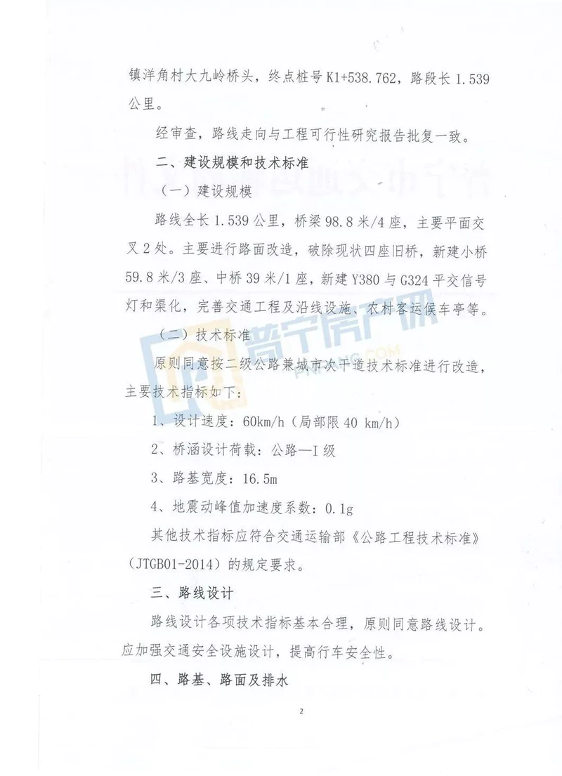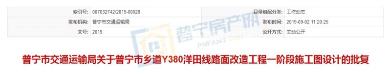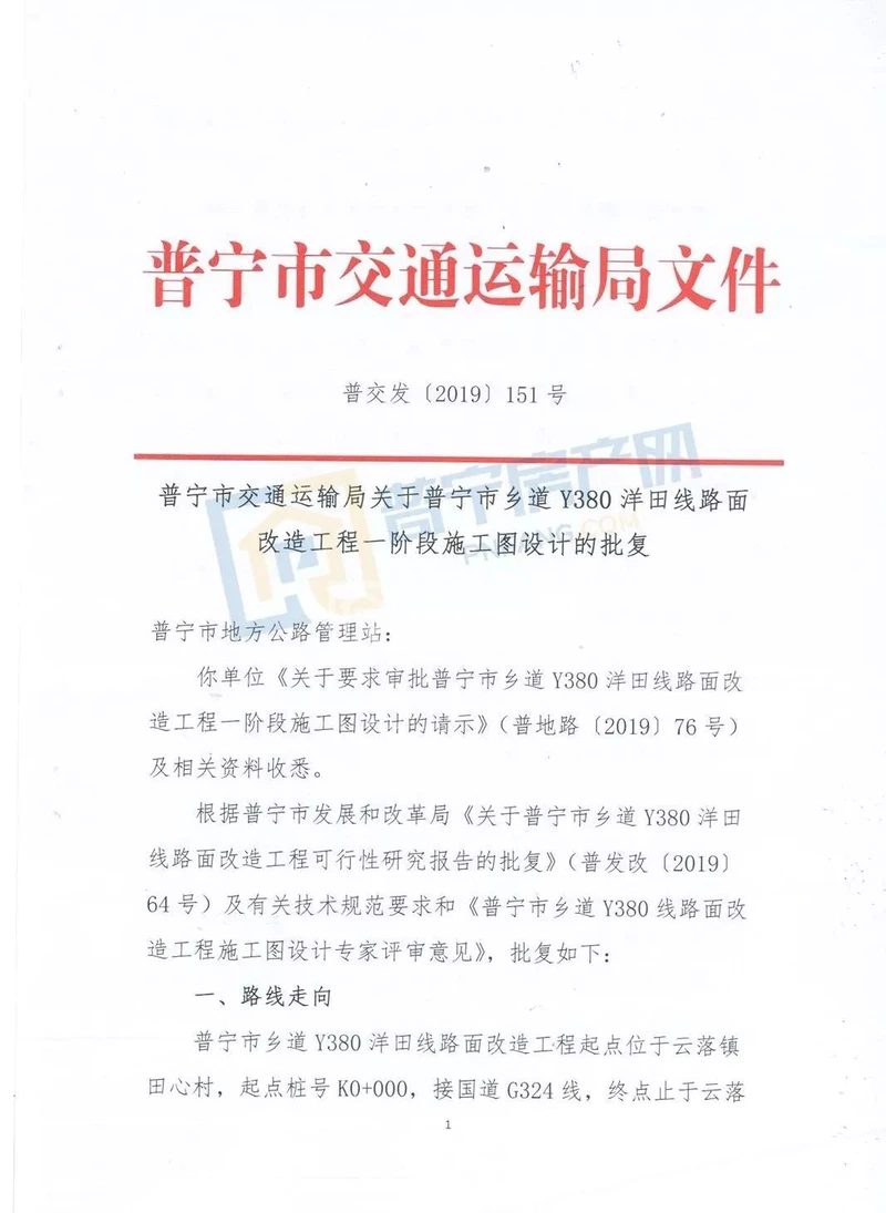 根据普宁市发展和改革局《关于普宁市乡道Y380洋田线路面改造工程可行性研究报告的批复》(普发改(201964号)及有关技术规范要求和《普宁市乡道Y380线路面改造工程施工图设计专家评审意见》,批复如下。