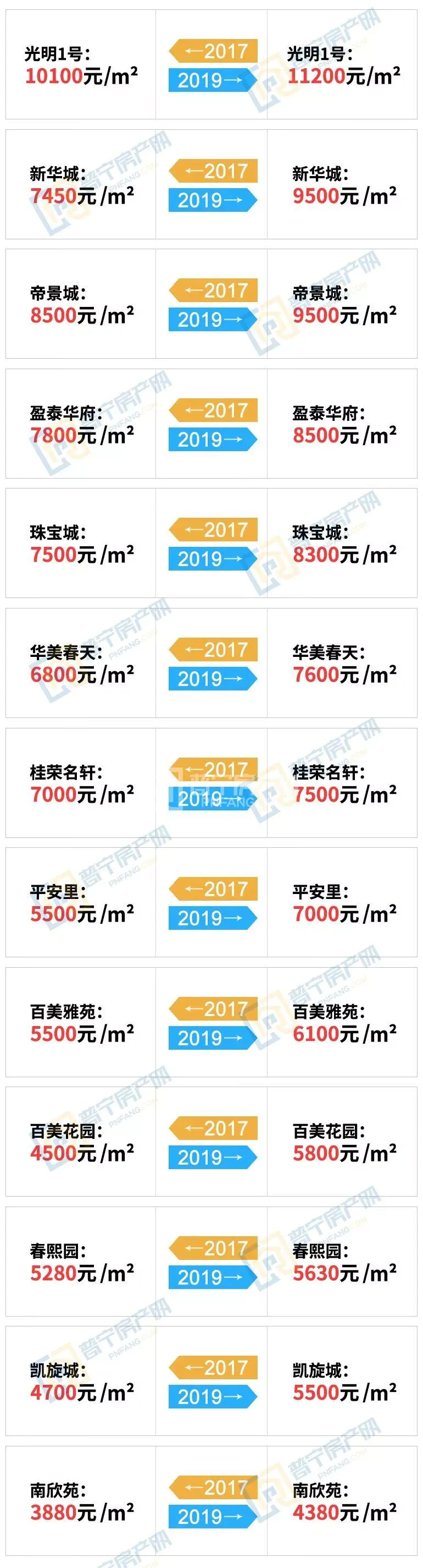 2017-2019年普宁各大楼盘均价对比