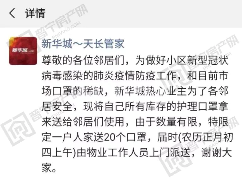 经小编了解,原来是新华城一名热心业主为了各邻居安全,将自己所有库存的护理口罩拿了出来送给邻居们使用,并交由物业工作人员上门派送,一户人家20个口罩,实实在在的温暖了大家的心。